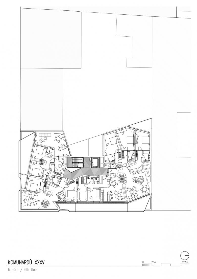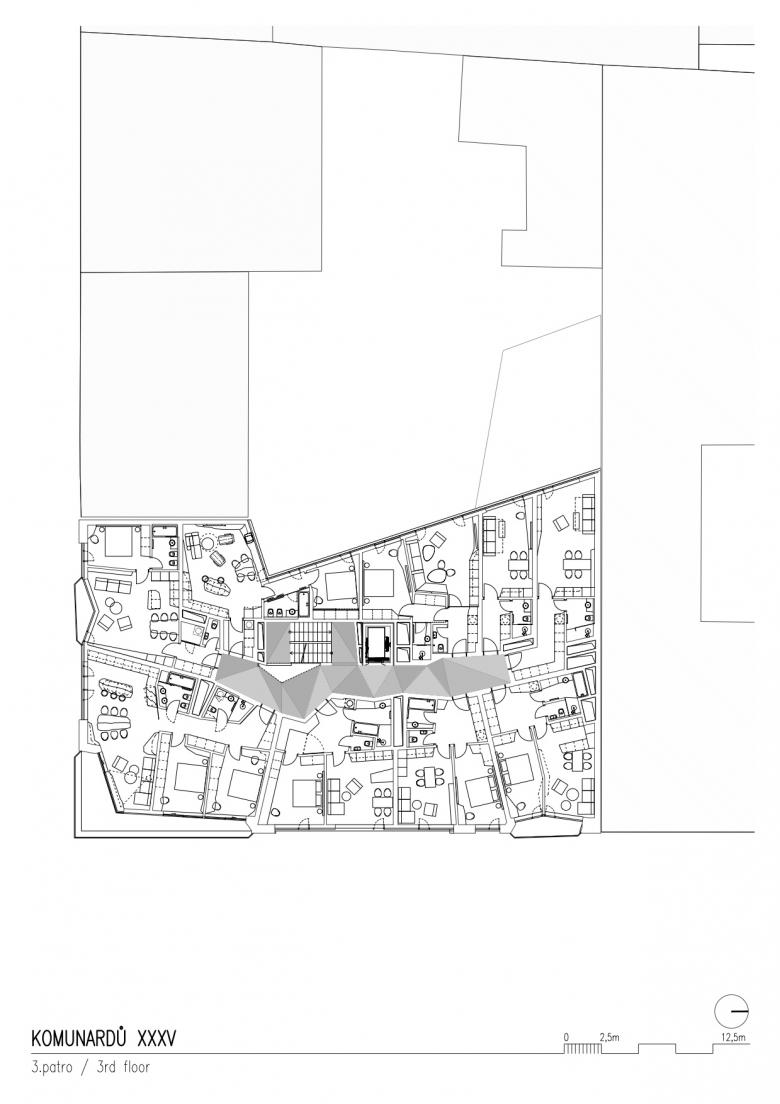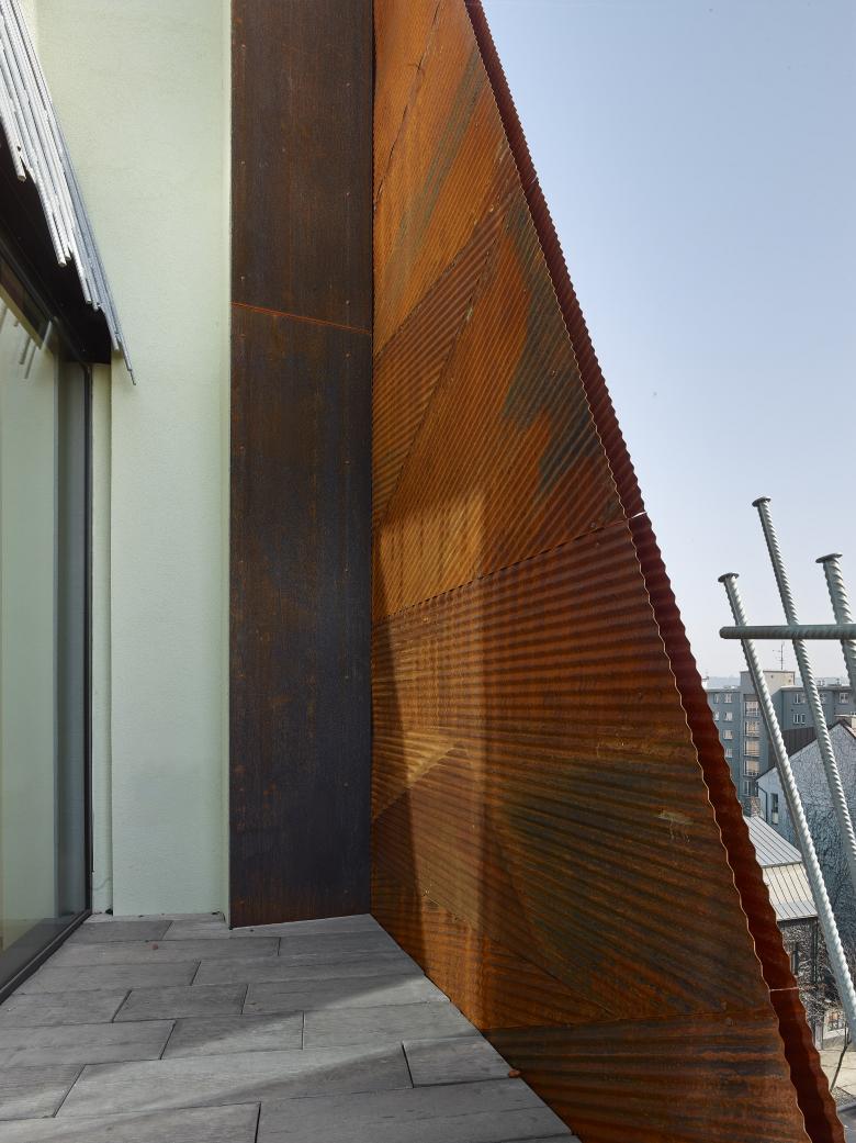Starting from the third floor, the building is designed as residential. With regards to its location on a busy city street and to the character of one of the most dynamic districts of Prague, it contains mostly smaller apartments for young people. However, we tried to create options to merge smaller apartments to also allow for a more universal development of the building. On the highest, seventh floor there are four larger attractive apartments with spatial roof terraces that give them an exclusive flavor. The building also includes three underground floors with a generous number of parking spaces.