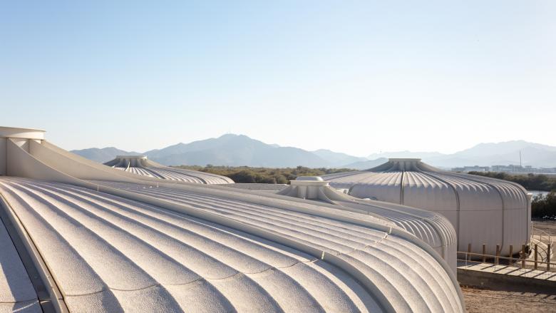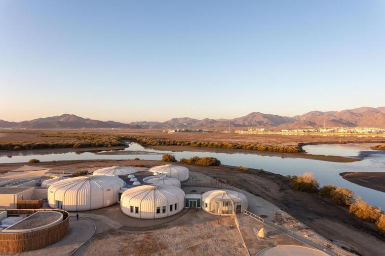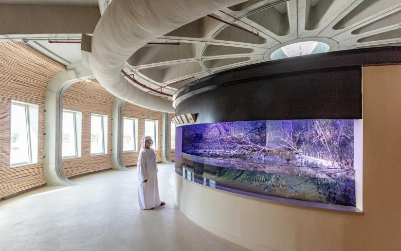 Seven interconnected pods and tensile structures create a visitor center, with a terrace and panoramic views towards the mangrove forests and distant mountains. Facilities include  aquaria, exhibition areas, visitor amenities, staff offices, veterinary facilities, classrooms, gift shop, and a cafe. A carefully set out nature trail encourages visitors to explore the reserve’s rich biodiversity of indigenous mangrove forests and mud flats and the species it supports including turtles, stingrays, gazelles and the rare Arabian Collard Kingfisher.