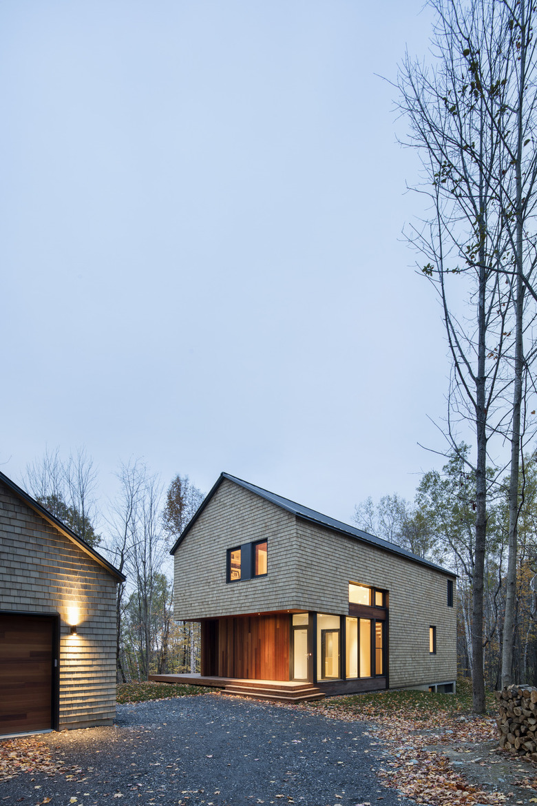 The KL house's natural cedar siding and tin roof are reminiscent of some of North Hatley's country homes. However, its elongated and streamlined shape contrasts subtly with the older, opulent homes on the shore of the lake. The house, and its adjacent garage, have a simple and well-assumed volume and a slanted roof with a small overhang, but this simplicity is destabilized by subtle shaping. The overhanging upper level covers the porch and terrace, protecting the windowed rooms on the main floor from the summer heat.