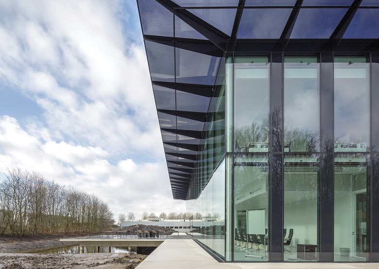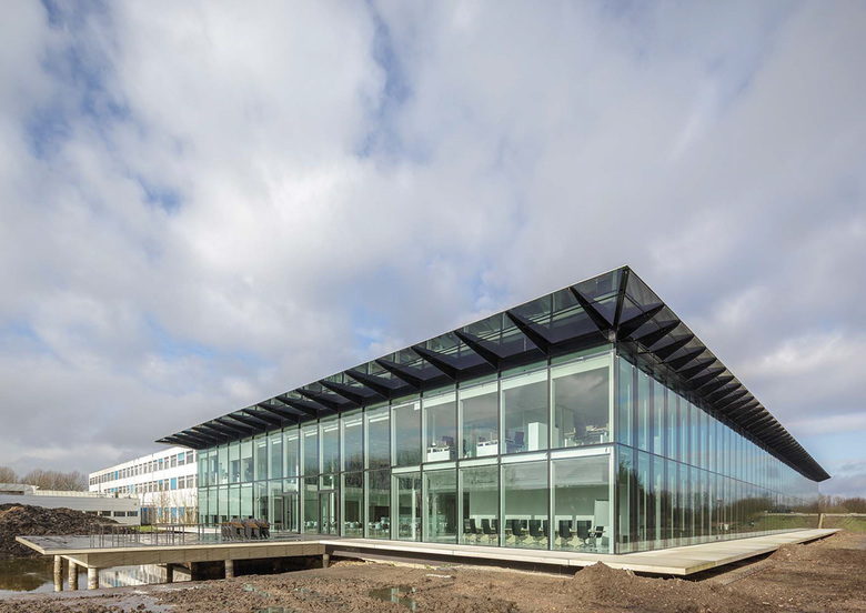 The parking spaces are situated apart in the green area, so employees have a short walk through the landscape every morning to get to the building. Bicycle parking is submerged under the path. The pavilion has a green roof that appears to run inside via the central stepped atrium, so that nature almost literally continues into the building. In addition, a series of integral sustainability measures were included in the design; these measures fit in well with KWR and are also in part focused on achieving optimal water management.