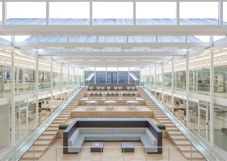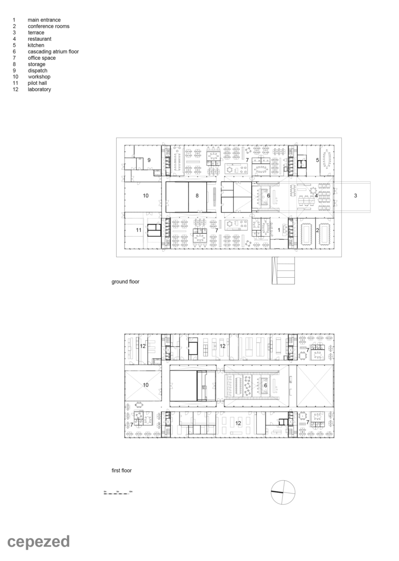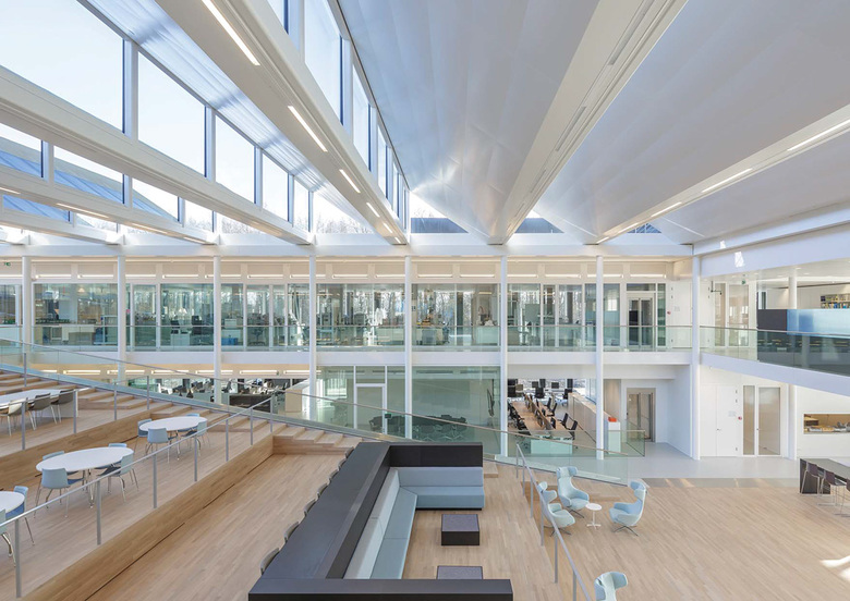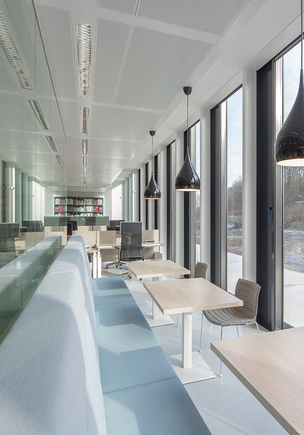 The building structure consists mainly of two generic bays twelve meters deep. These do not have any supporting walls and have a gross story height of four meters. This arrangement allows for every conceivable combination of laboratories, offices and shared functions such as meeting spots, quiet spaces, brainstorming spaces, meeting rooms, project team areas and so on. The bays are interconnected by means of passages and footbridges.