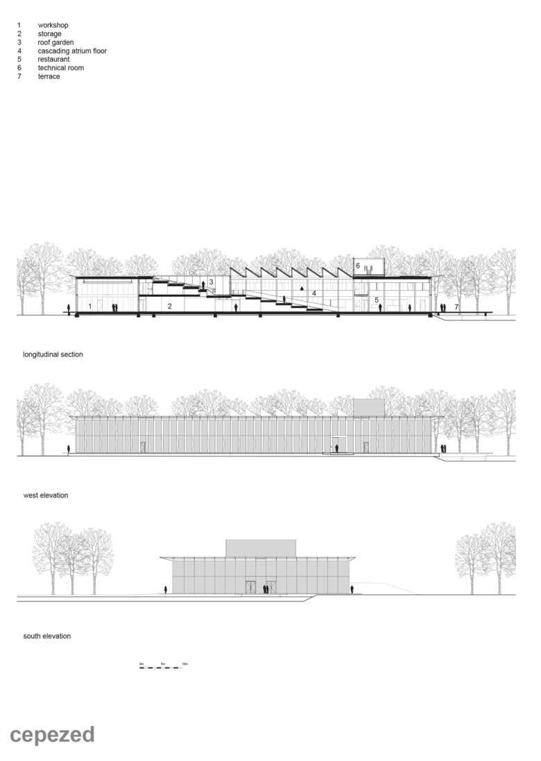 cepezed’s design is strongly interwoven with and makes maximum use of the surrounding landscape. The building is elevated more than one meter above ground level, making it an open, light and transparent pavilion on a plateau. To create a pleasant space outside and effective protection from the sun, it has been provided with a broad canopy at the top. The pavilion itself is largely made of glass, which gives the users an optimal connection with the green surroundings.