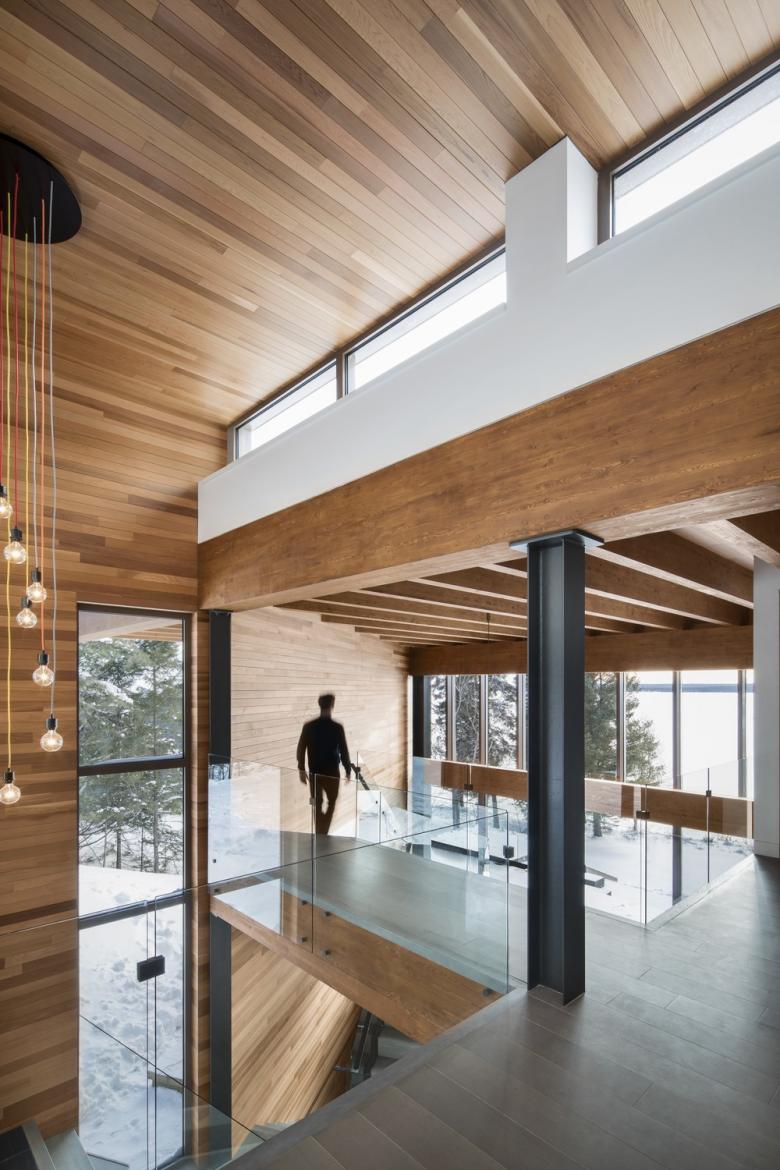 The original foundations were kept to provide a large storage area. A terrace with spa was built on top of the old house footprint, with wide stairs leading to the lake. This architectural gesture takes the form of an agora and becomes the cornerstone for the new house. The slope of the site is also integrated into the design: the interior spaces flow into one another as they follow the natural slope of the land. From the access road, passersby can see the upper level and the garage, while on the lake side, three levels rise elegantly above the ground, revealing a facade articulated by a series of angles and wide openings. The project seems to cling to the original house location, leaning backwards through the forest leaving the bank clear. The discreet entrance along with the open facade on the lake create a strong duality. The idea is not to reveal everything at a glance.