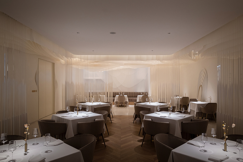 The design inspiration comes from the moment when the sense of taste is stimulated by delicious food as if the water ripples in the mouth, evoking the senses throughout the body, fully immersed in the French gourmet experience with a long and lingering aftertaste. Using water as the main design element, the designers choose white color to keep the whole space pure and clean, just like the white canvas set off a feast and create a sense of ritual for the dining experience.