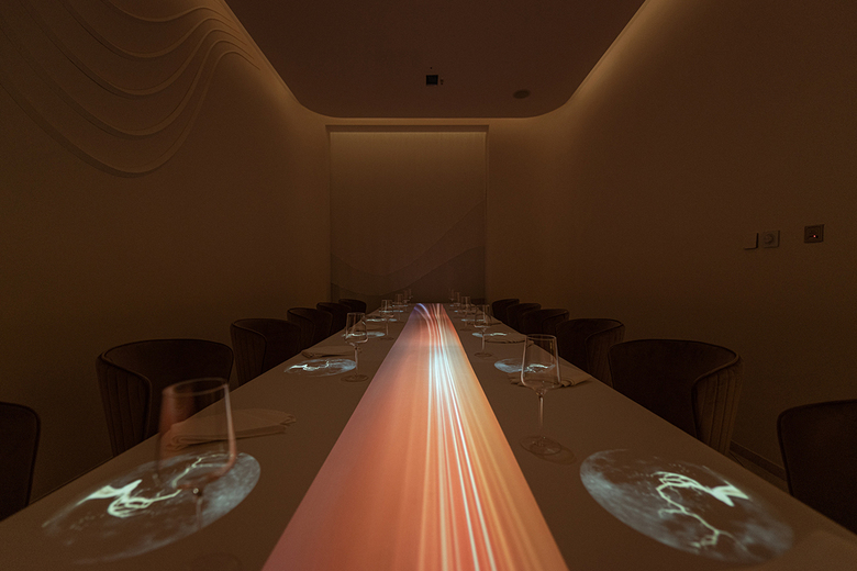 We create a private room by incorporating immersive dining experience through new media. The new media technology updates its content in a timely manner so that more immersive scenes could be produced combining better dishes and services, bringing guests a richness of sensory experience. We also utilize technical means to allow doors open and close without touching for a purpose of enhancing guests’ experience as well as their sense of ritual in this space.