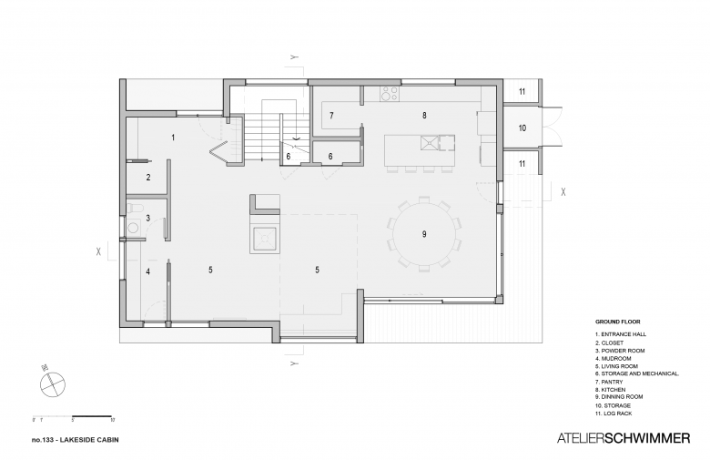 The cabin is centered around an atrium that opens to the outdoors. The design was developed around a fireplace set beside a triple-height area that makes it visible from everywhere within the cabin thus generating a canyon of hospitality. Located in the center of a concrete slab floor on the ground floor, it divides the open space into areas of various spatial qualities. On both sides of the canyon, glazed walls offer views on the outdoors. Traversing the canyon on the second floor is a bridge that creates more common space. Four bedrooms open onto the bridge.