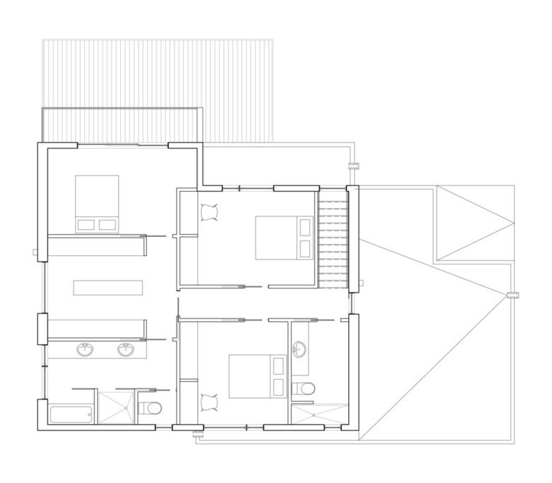 The addition of a floor allowed the creation of three vast bedrooms. The master bedroom consists of an independent module combining a wide walk-in and a shower-room. This room also takes advantage of a balcony towards the back of the house, and favors a place for the quiet pondering over the woods.