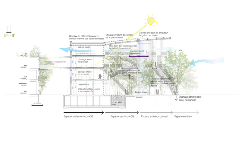 Opening up to the linear park in front, the Learning Center is invaded by nature. Inside, a wide atrium is inhabited by the light vegetation and a series of walkways and staircases creating numerous informal spaces for teachers, students and visitors allowing new places to meet or work. These platforms, the "spontaneous amphitheaters" and the classrooms are united under one roof providing promiscuity and privacy in an intimate relationship with nature. People won’t pass each other in corridors anymore, but meet in vivid places, in a unique space bathed in soft light, with surprising and changing views. The large transparent facade of the Learning Center opens to the West on the "Green", a vast public space covered by lawns and partly wooded. The building is thus seen as an open space revealing the activities taking place in its heart and stands as an architectural and academic emblem of the future neighborhood.