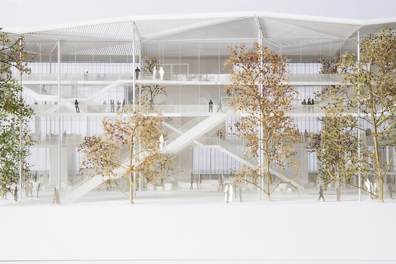 After the first jury, four candidates were finalists: Sou Fujimoto Architects + Manal Rachdi Oxo architects + Nicolas Laisné Associates, Atelier 2/3/4, Babin + Renaud and Chartier Dalix Architectes. The project led by the group Sou Fujimoto, Manal Rachdi Oxo architects and Nicolas Laisné Associates seduced by its openness to the surroundings, its transparency and its porosity. The front glazed façade is covered with a generous canopy while the vegetation is invading the interior space, thus blurring the limits between inside and outside.
