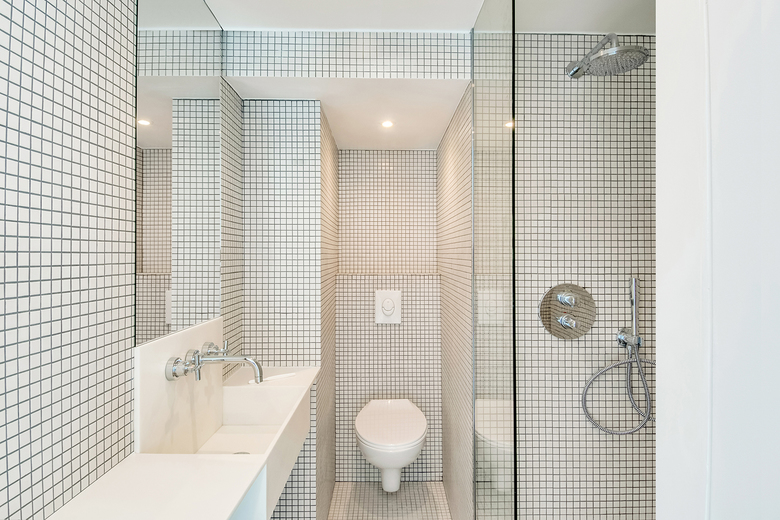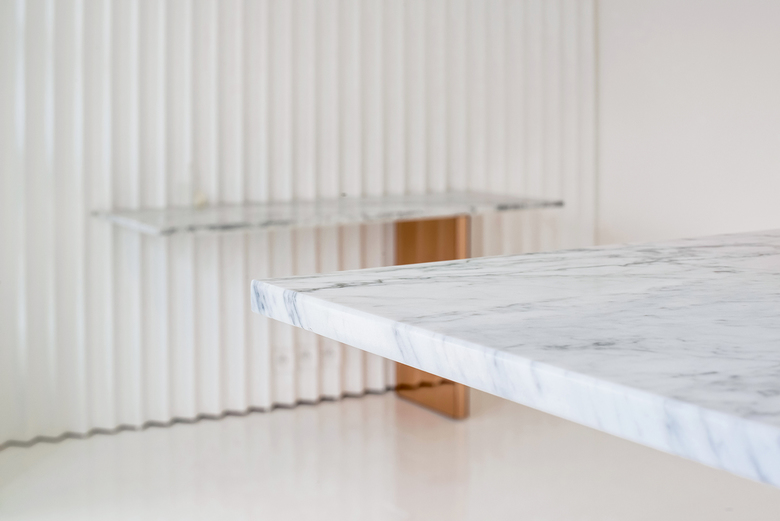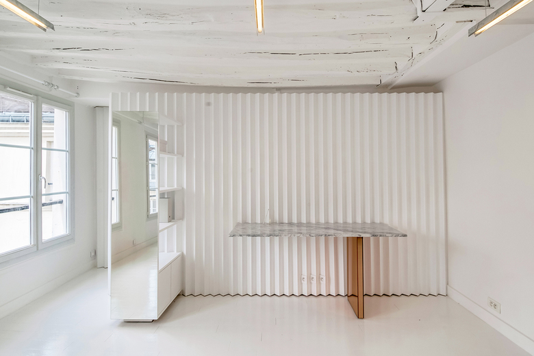 The flat has been entirely painted in white to emphasize the specific texture of each material. This work on texture can be found in the new elements that have been used: accordion, mosaic, marble and lacquers in a cameo of white. This neutrality of tints, barely disturbed by the light coming from the mirrors, will allow a subtle contrast between old and new.