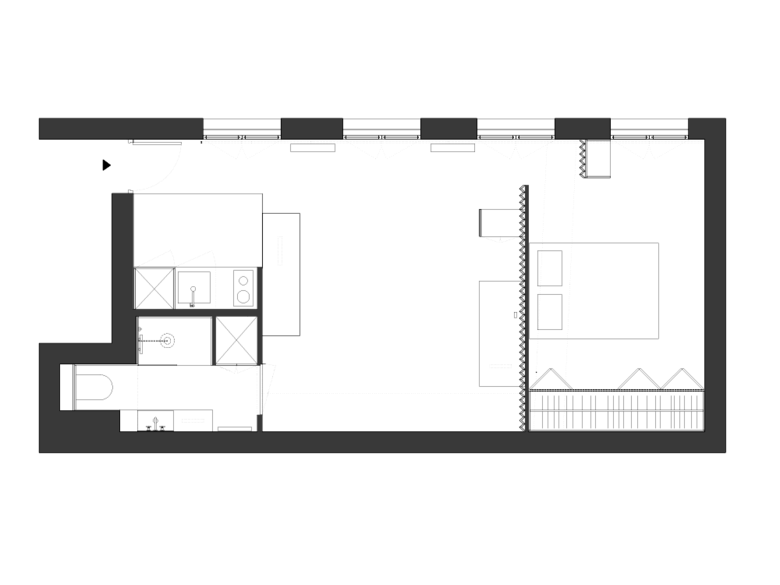 A compact and efficient technical block including the bathroom, toilets and kitchen will be located at one end of the flat in order to free a maximum space for the bedroom and the living-room. The bedroom, located at the other end will be separated from the living-room by a vibrating accordion partitioning. This partitioning will be designed to create an intimate and hidden access to the bedroom. The central space contained between the technical block and the bedroom will be dedicated to the living-room and the office. Every piece of furnituree will be custom-made and have a specific function that fits in such a way as to create a pictorial composition.