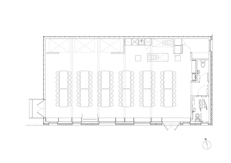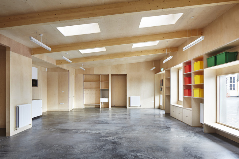 To keep costs down, a basic exposed plywood interior has been used, while externally, a colour stained timber rainscreen which playfully references the existing roofline of the school’s main hall.
