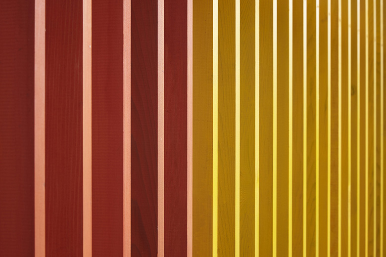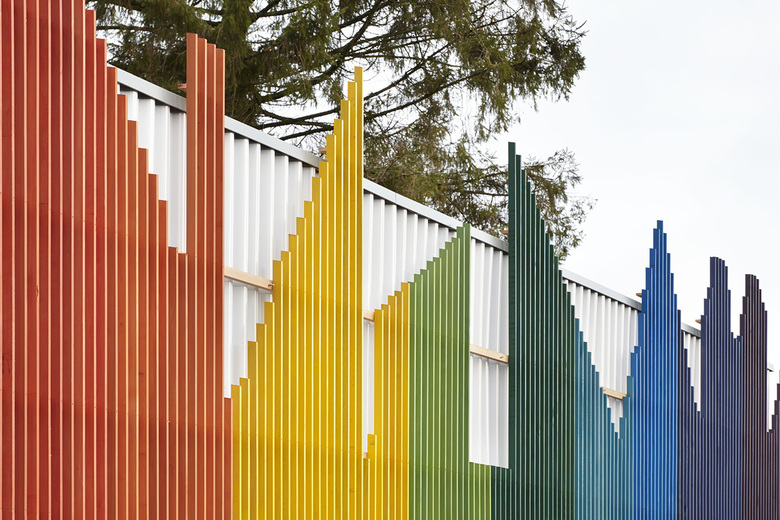 The colourful rain-screen cladding comprises western red cedar battens, which were stained before being positioned into place. The profile of the rain-screen matches the roof pitches of the existing school’s buildings to link the new structure to the old buildings. Internal plywood is sealed with a protective matt coat of varnish to give the material a durable finish.
