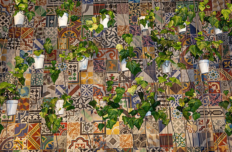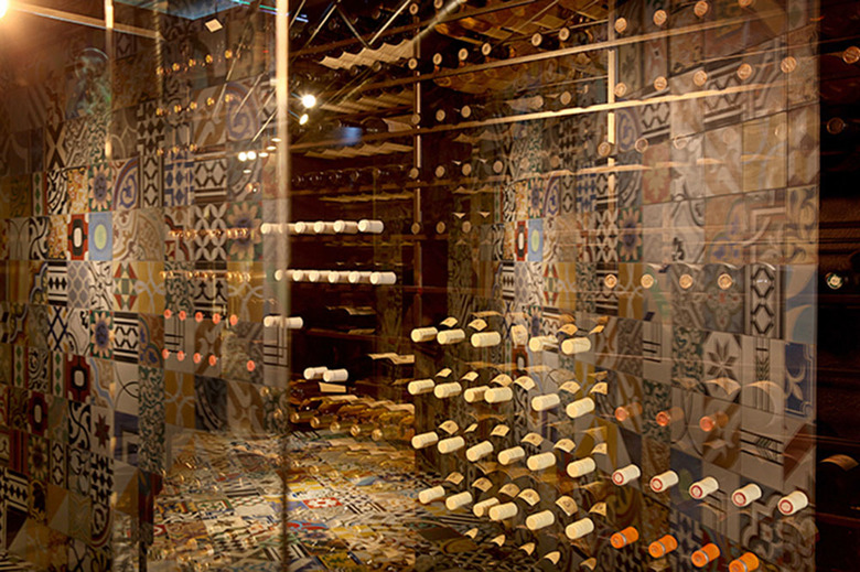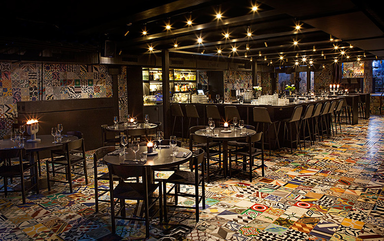 The interior design carries a number of main drivers — colorful tiles, black furniture, a vibrant green wall, and brass light fixtures — that together create a spatial configuration conducive to linked experiences throughout the restaurant.