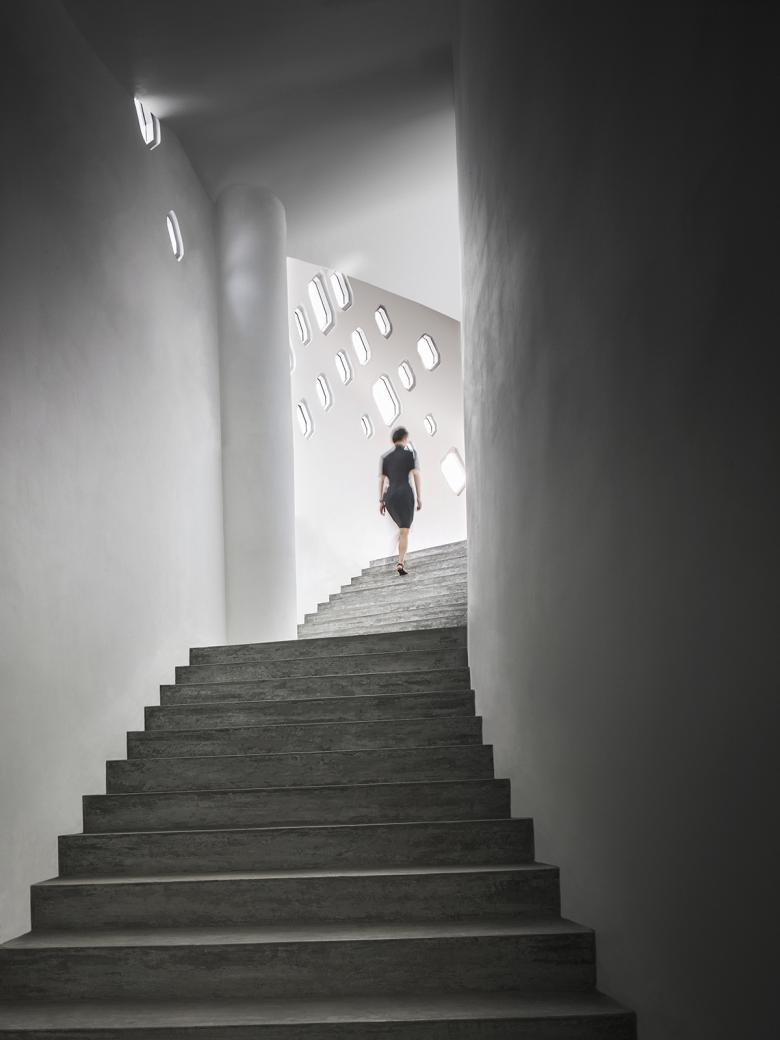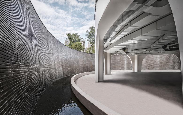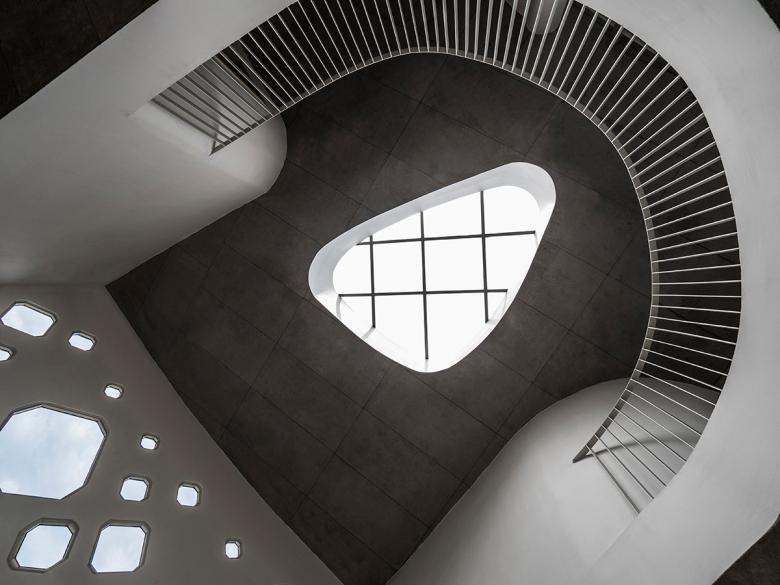Not far from the entrance, you will first see a small building with white facade and drop-shaped windows that are arranged organically and twinkle under the sunlight. The half-moon pool forms a waterfall from top to bottom, and the sound of water washes the noise of the past. The semi-circle gate and the circular platform echo from top to bottom, forming a metaphor of moon mirroring in the water. Arriving at the inner atrium through the door opening, a large oval pool appears, where the skylight is reflected from the water surface to the surrounding curved glass windows, leaving an unfilled scene on the white wall. The revealing round hole in the pool is connected with the underground to form an atrium, to leave the green bamboo slightly appears. Light penetrates through the leaves and the diamond-shaped glass on the bottom, along with the light wave points dancing in the shadows of the trees below, forming a wonderful water-light concerto. The hollow part of the white building is reserved for the sky and earth, which reproduces the mysterious realm with the changes of light and shadow.