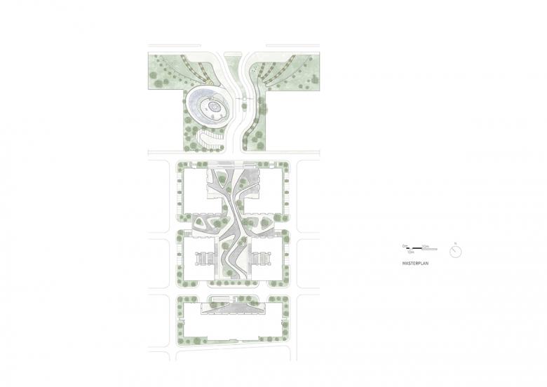 On the main entrance square of Chenglong Avenue, a series of hills are standing there, like the outstretched hands to streamline the cars. The ups and downs of the terrain filters the noise on the roads and the winding lane restricts the traffic speed, converting it into a joyful visit. The masterplanning of the pedestrian is considered with the separation of the vehicles, so the parking lot is on the lower ground and the design of the pedestrians extended from the large ladders along the landscapes to the inner space.