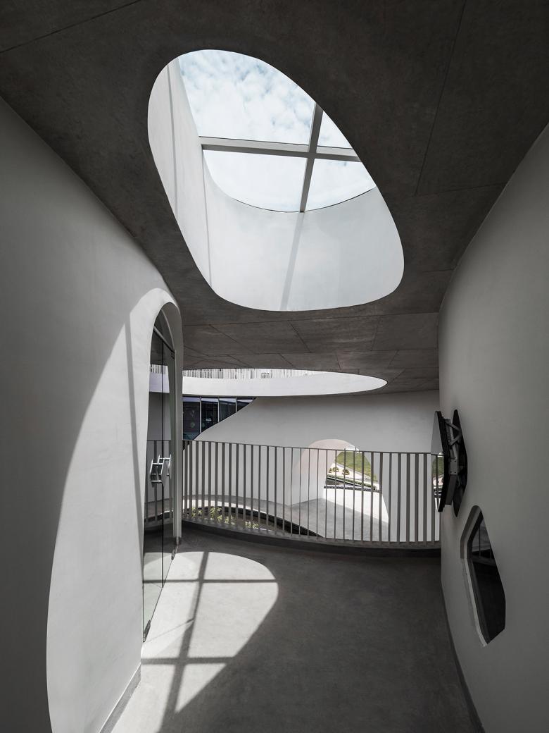 The surrounding space integrates leisure, exhibition, conference, reception, office, diet, etc. together to create an intimate and friendly feeling. The facade endows its water temperament, enables the light to present vibrantly on the clean white wall. The external window was designed horizontally to adjust the light and temperature. The concrete structured space blurs the boundaries of the atrium under the partition of large floor-to-ceiling windows. The upper ceiling curved holes formed naturally with the water shaped drops by the skylight that penetrates from the outside to the inside. Green energy was considered in the design as it collects the rainwater to the pool and cooling the building temperature.