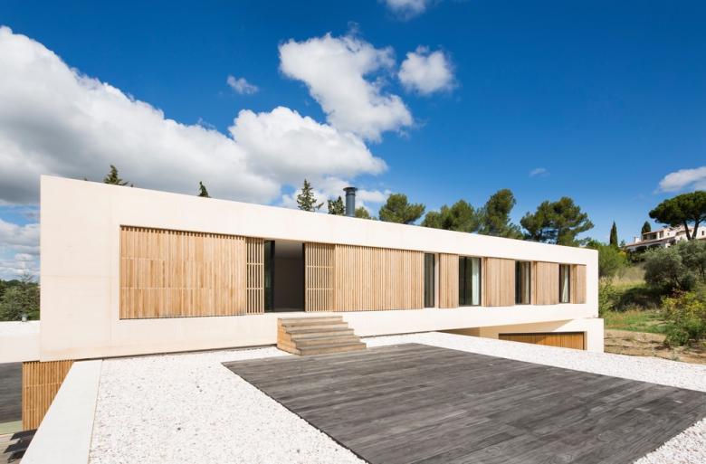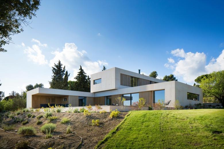 MaisonA is nestled on the side of the hill on the plot. The building is discreet, but its pure lines show great strength of character. The materials used – wood and white concrete – are contemporary, but the whole fits in perfectly with the protected site.