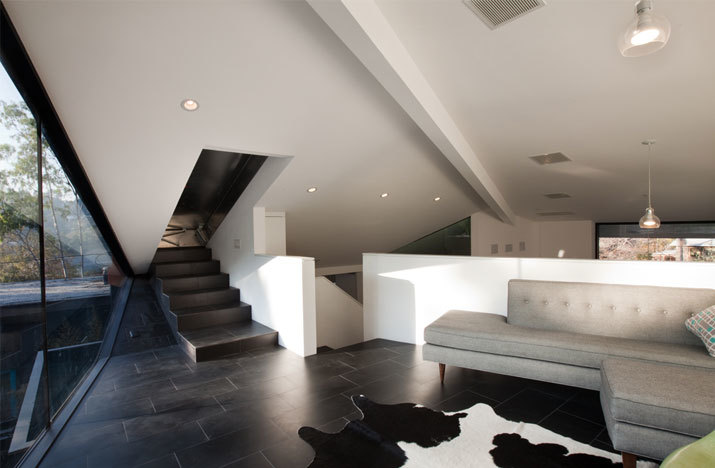 The sectional geometry of the residence, the multiple operable apertures located around the perimeter, and the operable hatch connecting the mezzanine and the roof deck completes the passive environmental cooling strategies employed. Through the adjustment of the various building apertures, stack ventilation and convective cooling is achievable.