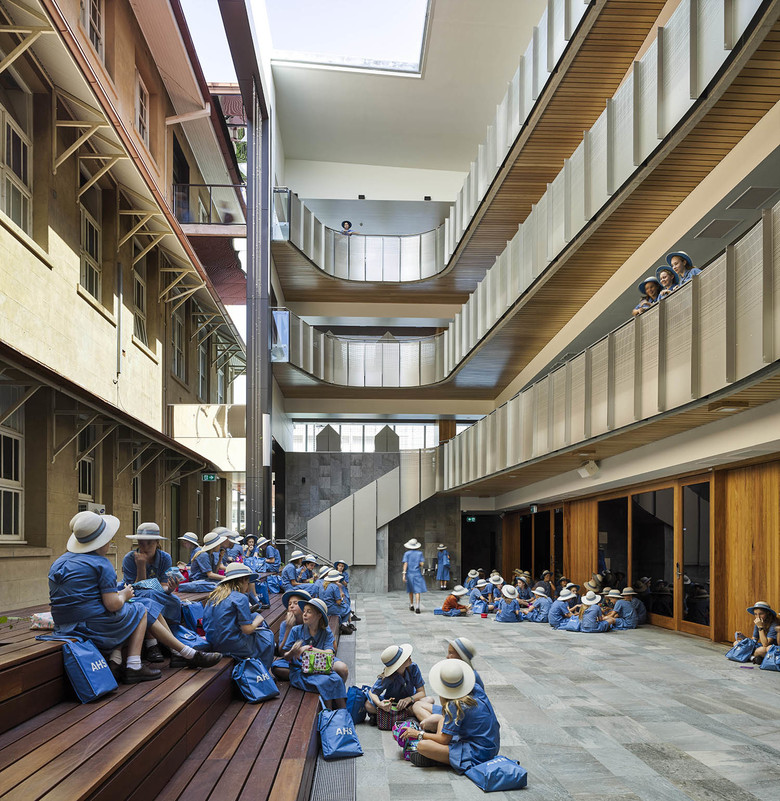 With this project for fifteen new classrooms serving year seven to high school, the challenge was to place a new five-story contemporary classroom building in very close proximity to some of the oldest school buildings in Brisbane.