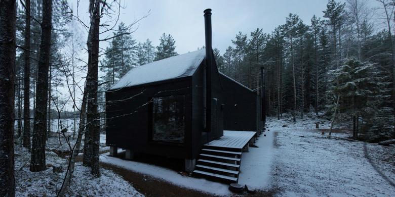 The simple, archetypal buildings offer a unique and contemporary interpretation of the Mökki typology. In its closed state the volumes appear as black, archaic monoliths. The interior contrasts the outward appearance with a light and warm owing sequence of rooms. White and untreated wooden surfaces divide the kitchen, living and sleeping area into different zones.