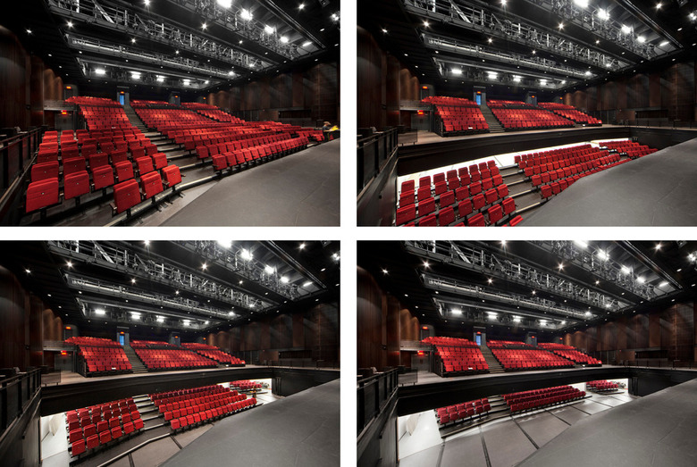 The hall is divided in three sections that combine a series of mechanisms for easy and efficient reconfiguration. The portion closest to the stage consists of a platform on synchronized Spiral lifts with seating sections gliding on rails. The middle portion has telescopic seats that retract to provide additional floor space when needed. Finally, the rear section of the hall features a mezzanine of 184 seats whose guardrail can be removed.