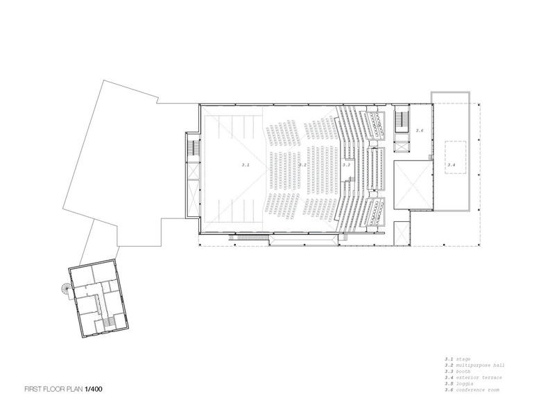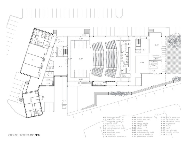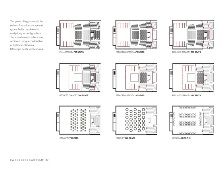 The guidelines of the architectural competition initiated by a local non-profit society stressed the need for a multipurpose hall able to accommodate traditional performing art events and offering a series of other configurations for cabarets, banquets, corporate events, and trade shows. The capacity of the hall is variable from 700 to 270 seats in order to accommodate comedy shows, theatre presentations, school performances and various concerts. The gross floor area for the project is 3500m2 and the budget for tender as $9.2M excluding equipment and taxes.