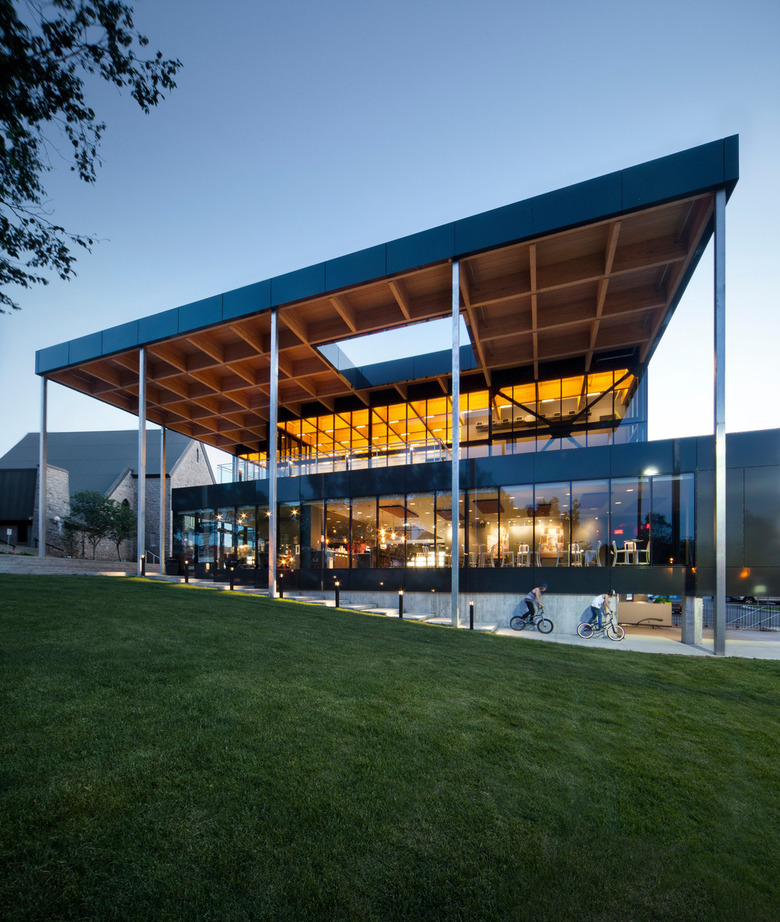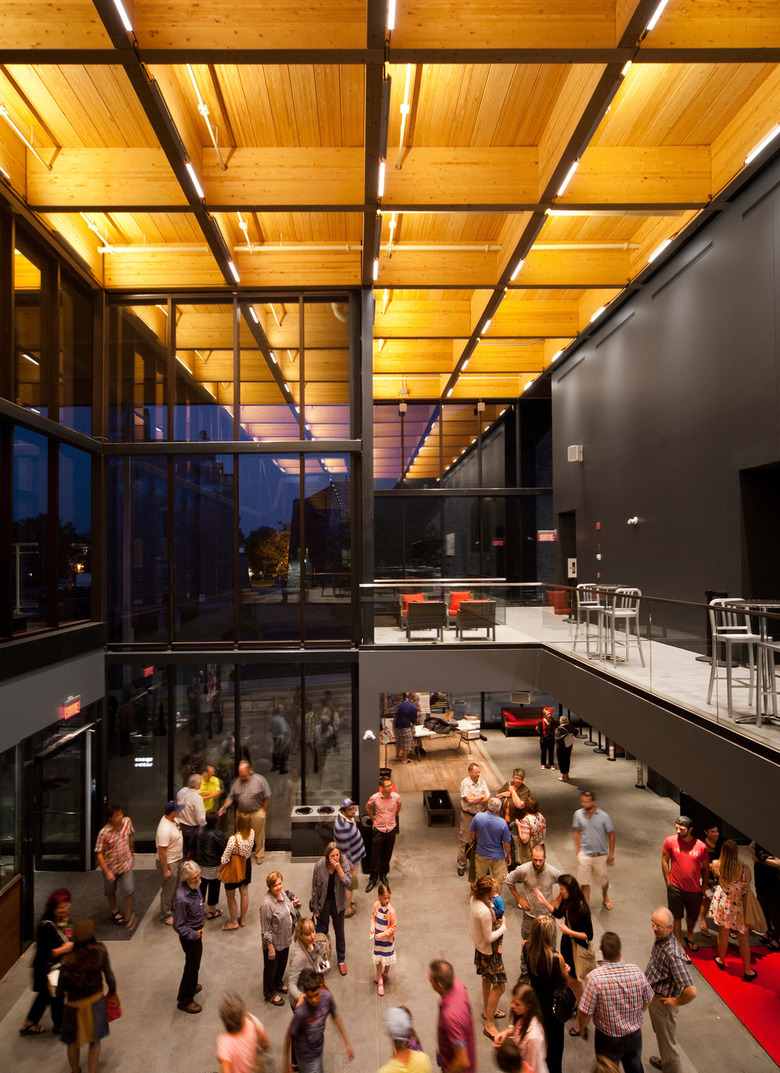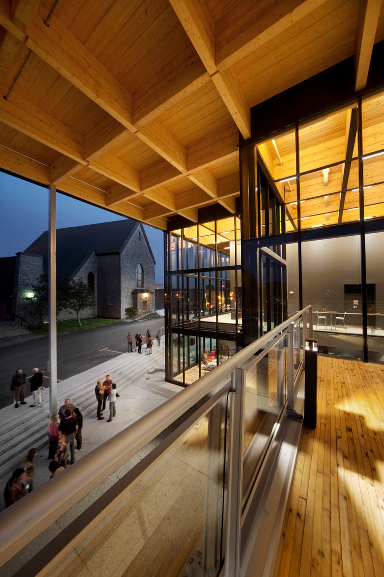 Our architectural proposition was based on a structural grid of cross-laminated wood beams that supports the roof and creates a canopy over the main entrance. It clearly communicates the importance of wood for the region and supports the local development of new technologies that add value to this natural resource that has a better environmental footprint than steel and concrete.