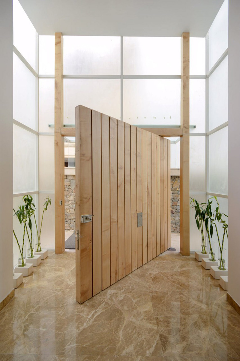 The next announcement is the massive pivoted wooden door surrounded by panels of glass that cannot but help attracting attention, as together they get down to the business of introducing the idea of larger than life volumes that are going to be the tours de force of the house.