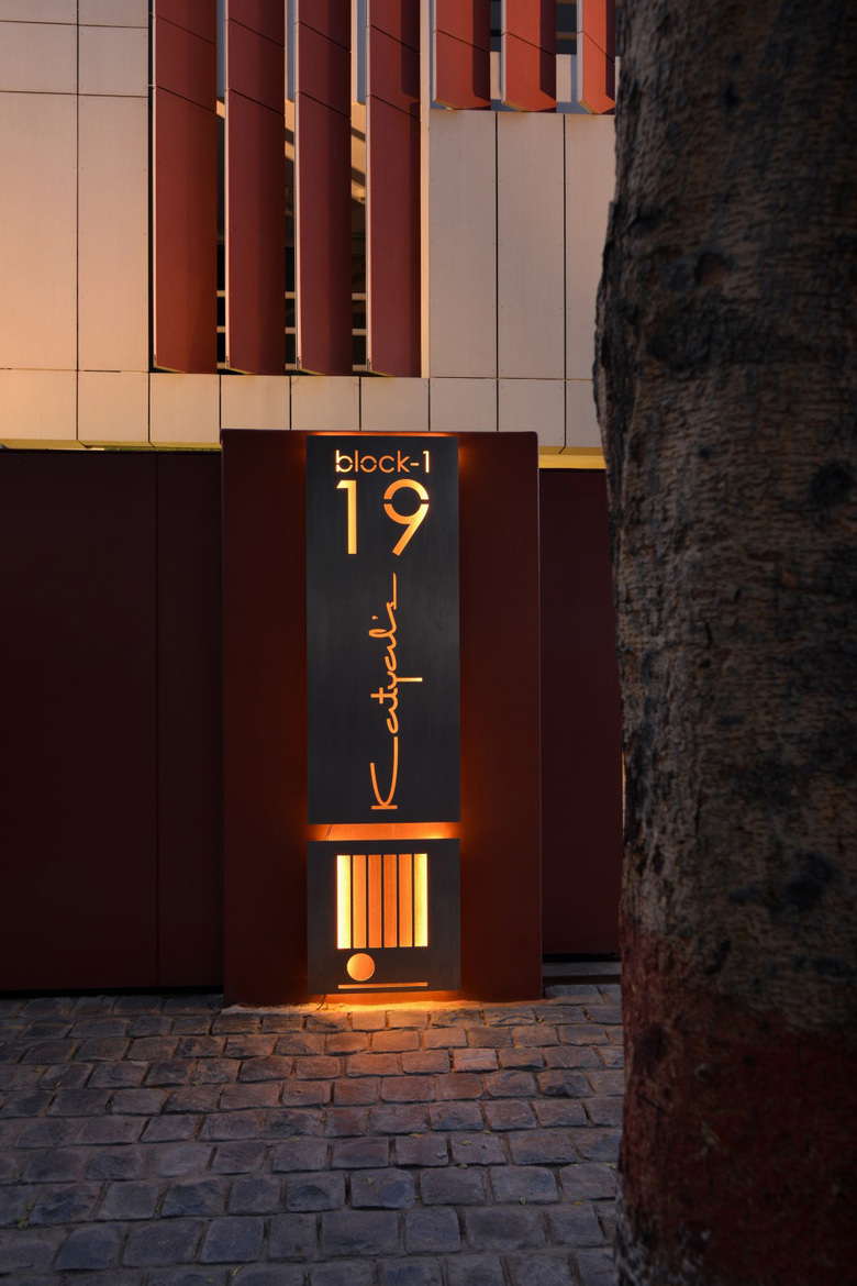 The arrival itself is announced in a grand fashion-almost in defiance of the paucity of space, as cars navigate a sensuous sweep of an entire half circle before they come to a halt. The background for this showbiz is ensured by making the setting – the driveway flooring, the boundary wall and the servicesas the guard’s cabin – a monolith that fades away. Lighting that bounces off the rough textured wall then guides visitors through a walkway to the back garden.