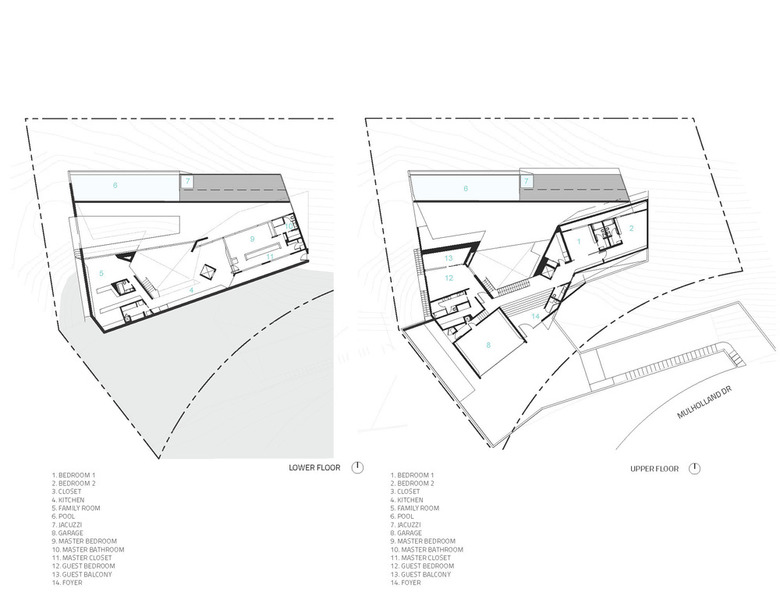Located on Mulholland Drive, this single-family residence scheme was molded by the strict regulations of the Mulholland Scenic corridor plan along with extreme site constraints. The residence is integrated into the surrounding landscape with a geometric appearance mimicking the terrain and sudden deviations of rock formations within the natural landscape. Sunken 18 feet below street level to ensure clear views from the street atop the building, fitting the project within the two story envelop became the main limitation. The private rooms and a convertible office with a sliding partition wall is housed in the upper level and the main living and entertainment centers were situated on the lower level, aligned with the outdoor deck and infinity pool.