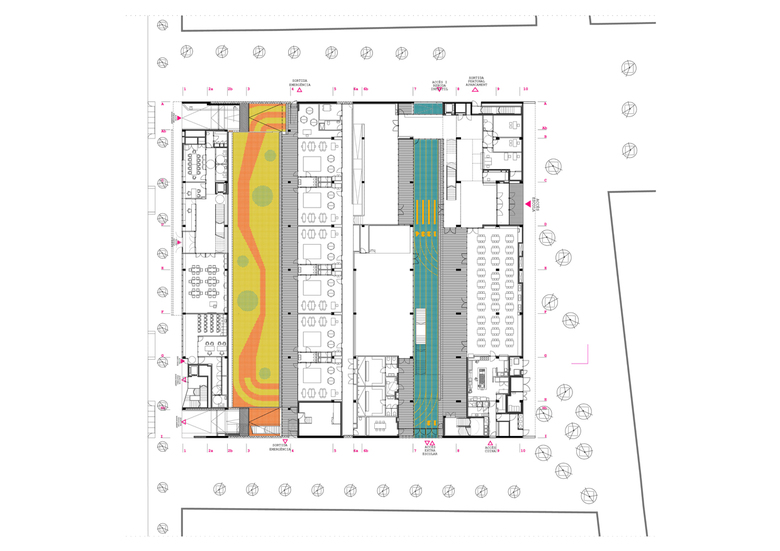 The construction of two basement floors, dedicated to a public underground car-park, allow us to think of the school as a very big roof, and rethink this as the playground areas of the school. Taking this decision generates a variety of outdoor spaces, such as patios on street level, porches (transition spaces) connected to these courtyards, vast open spaces on the first floor and a space for an urban allotments on the top terrace of the main building. All these outdoor spaces organize the indoor spaces according to the visual and physical relation with them.