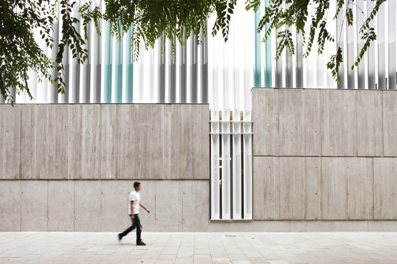 The side street façades are put together in a very heavy and tectonic way, with textured concrete walls and a perforated steel enclosure, forming an abstract pattern. These façades are aparently the most heavy and closed ones, but at the same time are the facades that allow the straight visual relation in-between the street and the courtyards.