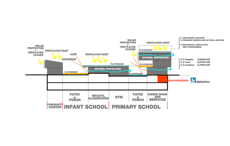 The construction of these type of façades and roofs, the sunscreen protection to the south and the connection to a District Heating and Cooling Urban System (Districlima) build an urban school with the Highest Energy Rating Class (A).