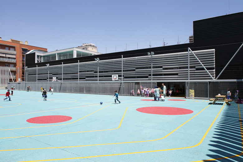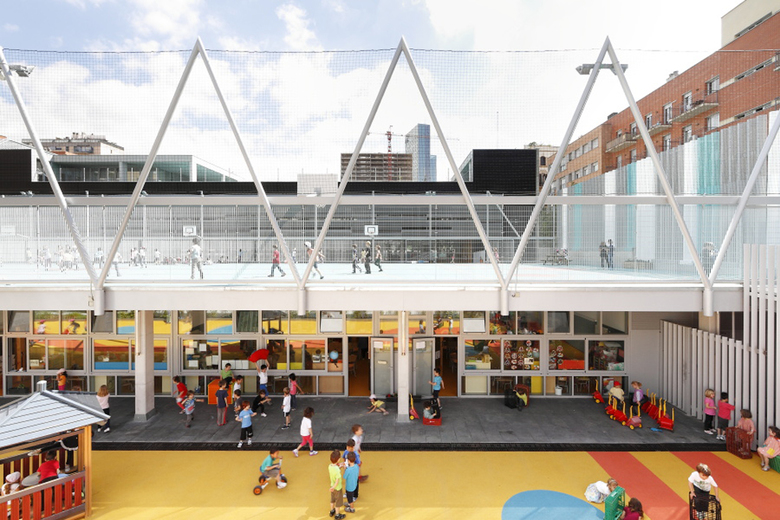 The building is situated in highly dense surroundings where Cerdà's Eixample merges with the Poblenou industrial layout. The dense and complex program (indoor and outdoor), the dimension of the plot, the rigid urban planning rules and the unmodifiable underground position of the car-park, forced a rethink of the standard directives of public schools and how to adapt St.Marti’s to this specific location. The bulk program of the school is located on the ground floor and all the roofs become the school’s playgrounds. The proposal alternates with equal importance the voids and constructed areas. Consequently, better use of natural light, ventilation and views over the inner school spaces are made possible.
