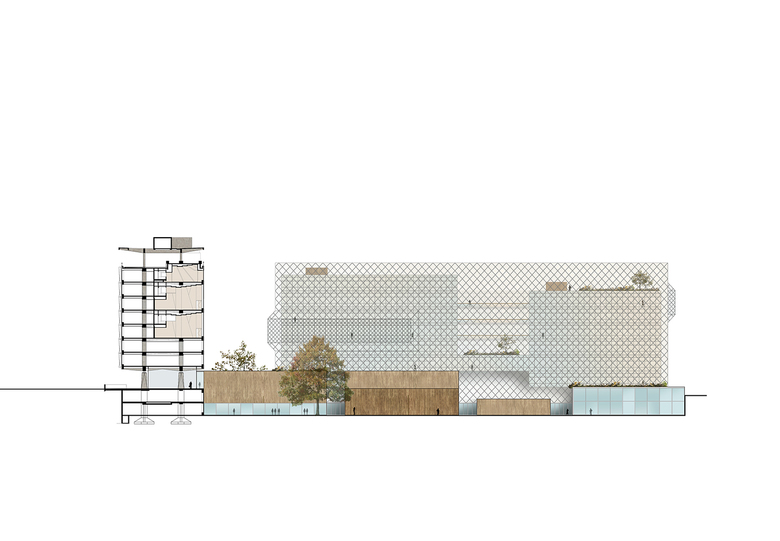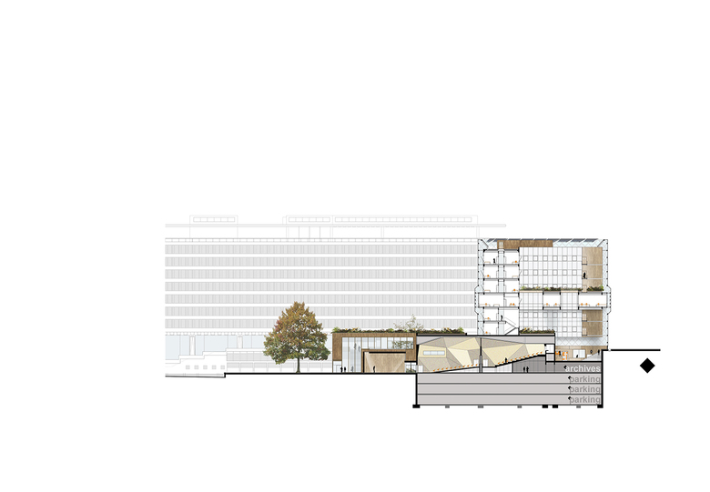 Fifty percent of the New Building’s roof will have solar panels to supply a portion of the energy needed by the building. Solar panels will also be installed on some areas of the East, South, and West facades of the building. This effectively turns the facades of the building into energy generators.