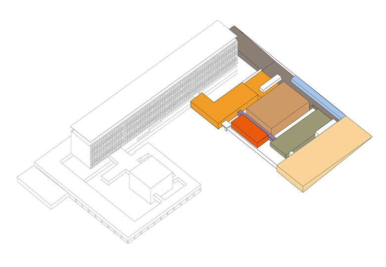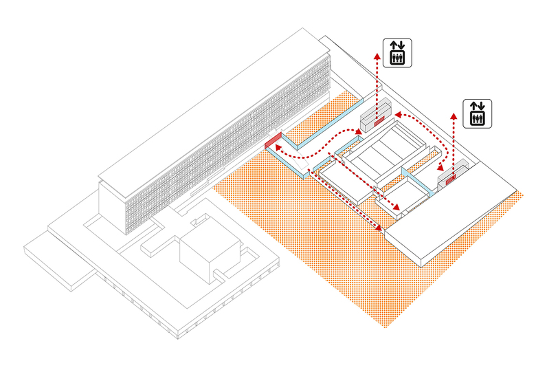 The New Building contains six floors with a total area of 14,000 square meters in both open and enclosed office space. Its basement is designed to have maximum exposure to the existing WHO organization campus.