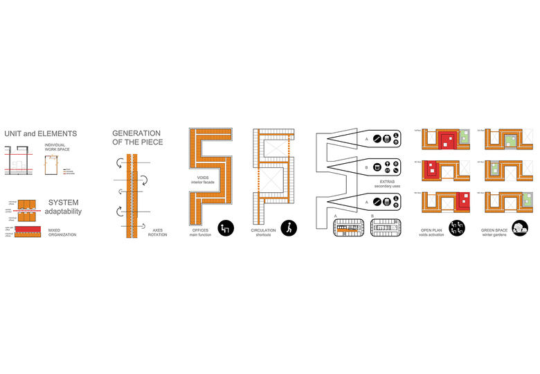 The general office layout of the New Building is based on the design of the "most efficient individual office unit," where all of the vertical surfaces in an office are movable in order to create an open space.