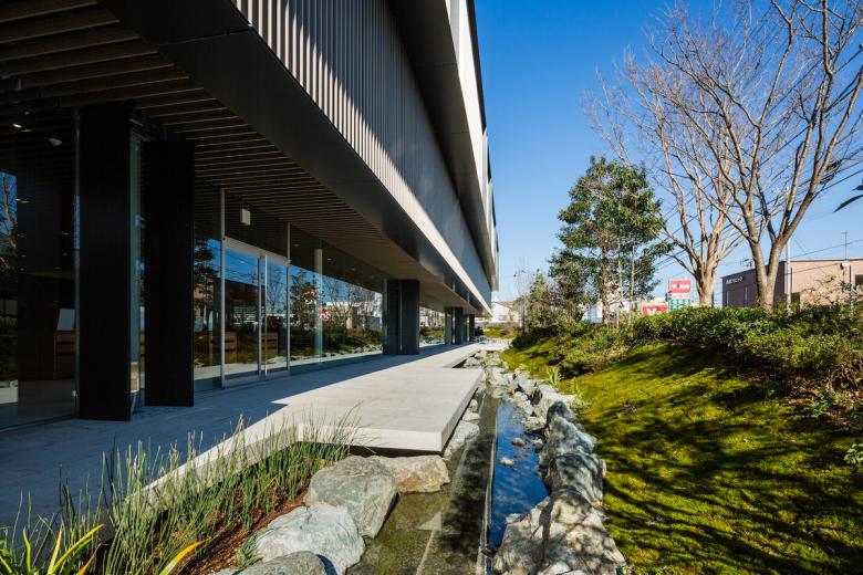 The louvers on the façade of the NICCA Innovation Center envelope the space in a tender embrace, constitute an interface that expresses the identities of Fukui and NICCA Chemical, and forge a link with the community and its lush green landscape.