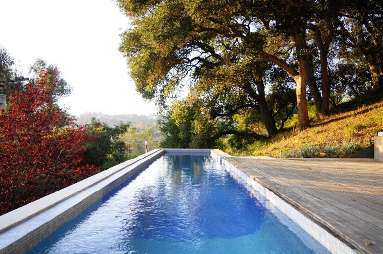 In order to accommodate an additional regulation requiring a second exit, based on the home’s total floor space, Heusch made another innovative architectural tweak. To meet the requirement, he built a small bridge and staircase exiting the elevated master bedroom, which leads down from the hillside to a pool area and adjacent Zen-style garden.
