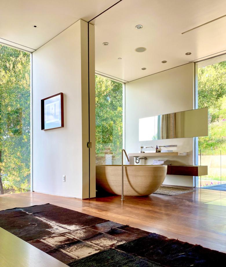 The interior of the single-level layout is framed by natural stucco walls and Brazilian walnut floors, with custom-designed furniture, cabinets, fittings, and profiles that further embody Heusch’s minimalist vision. There are three bedrooms, including two guest bedrooms that can be linked together courtesy of a sliding wall. Spanish marble anoints the guest bathrooms, while the master bathroom is accented by Portuguese limestone, including a soaking tub that was hand-carved from a single block.