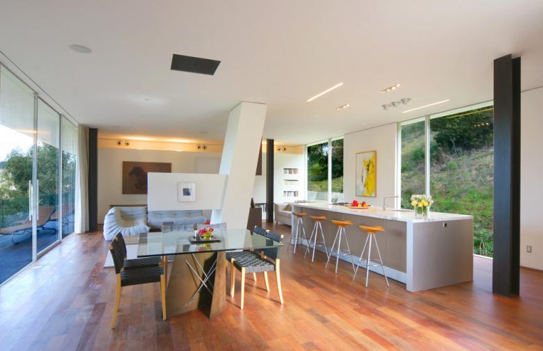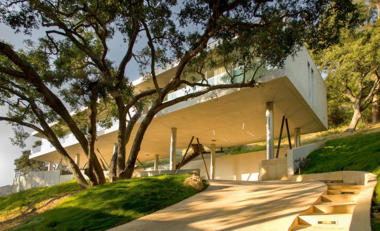 The plan he put forward was to build 10 steel columns to support an elevated house, which he successfully argued would mitigate any landslide threats to the built environment. The innovative solution allowed him to forgo the 15-foot setback by building a much smaller, less obtrusive retaining wall into a natural cut in the property. The design plan provided a platform that would enable him to build his spacious, modernist home into the treeline of the embracing hillside.