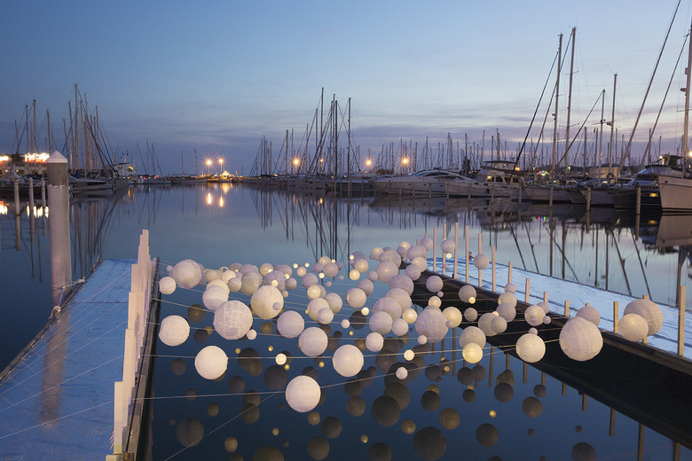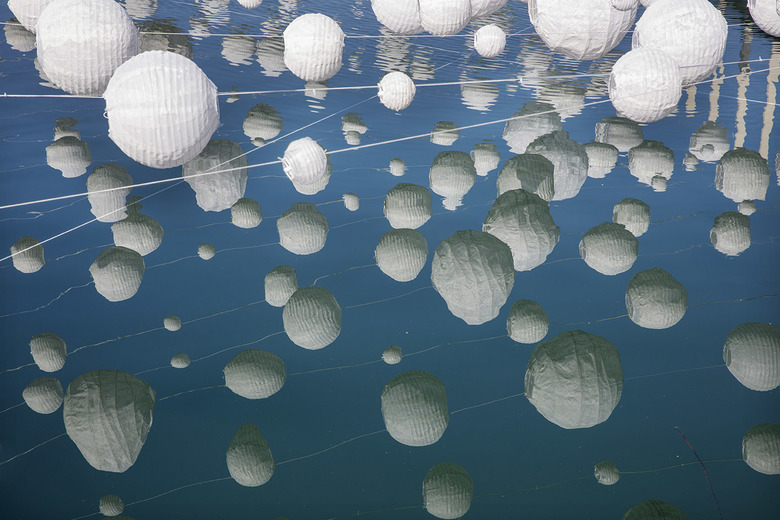 The spheres, dressed in embroidery, open a dialogue between full and void. Indeed, the texture of the lace creates a game of shadow and light. Applied on floating spheres, it offers roundness reflexions on the water.