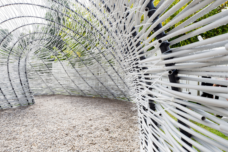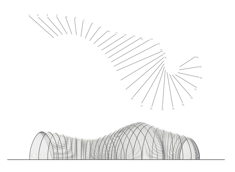 The geometry follows two guiding curves defining the surface edges coming from the interaction between the existing structure and composition of the internal space. The 3d model shows the length of the arches and they are cut according to the measures. At this point the arches are ready to be put in tension with wires and fixed to the support creating the self-sustaining system. Temporary structures bear the arches meanwhile pvc pipes are weaved on the arches and fixed using plastic pipe tie. The finishing is a gradient of sizes of gravel placed on the ground according to scale of the interior spaces.