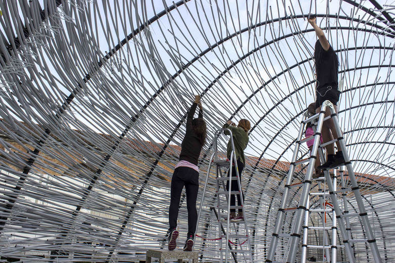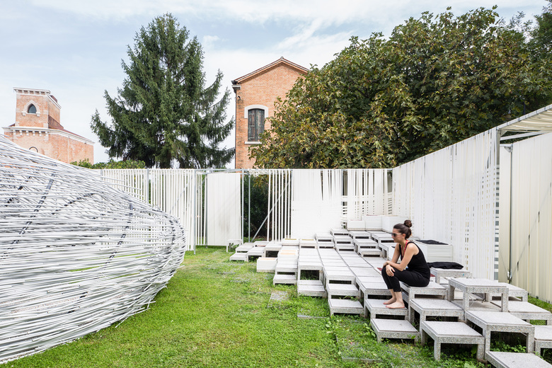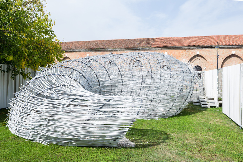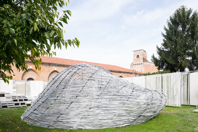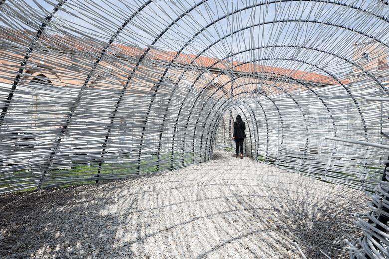 The Bug Dome Structure was originally developed for the Shenzhen Hong Kong BiCity Biennale in 2009 by WEAK! Architects as an icon of illegal architecture for the use of the people. Today the structure in Venice is used as a physical research of fundamental elements of the traditional space. Understanding the basic concepts behind traditional Chinese space creates the reference to developed the design. A layer of nonwoven textile makes the support of the structure and a protection of the ground. On the top, a metal net is the grid to locate the position of the feet of the arches using coordinates. The workshop uses contemporary and locally produced material, such as wires, metal nets and PVC pipes. The pipes are bent to create self-sustaining arches that guarantees zero impact, as well as a temporary environment for the fragile Venice Biennale venue.