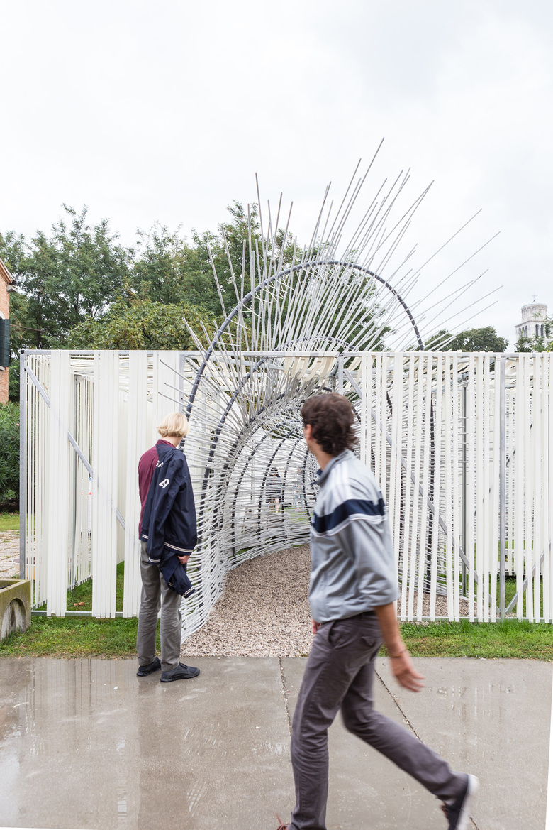 The interior is the result of 4 systems shaped by a single element as curved mesh, creating different elements of the architecture. The entrance shows itself, inviting visitors to be adsorbed from the surrounding, hiding the main room and creating expectation, pushing the inside exploration. The corridor opens to the main space, where the scale gets wider as the texture of the ground gets bigger, changing the equilibrium and the sound of the experience. The space recompresses next to the exit outlining the view of the Arsenale watchtower on the other side of the canal and bringing back the visitors to the Venice Biennale environment.