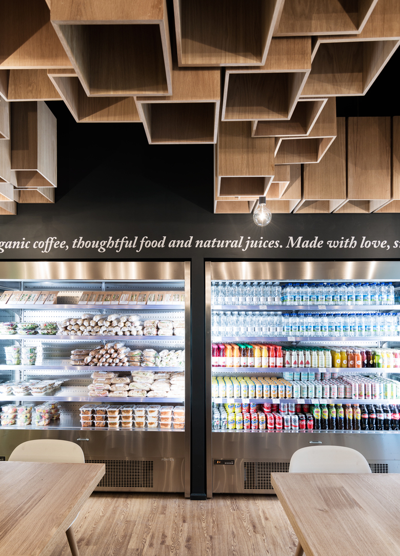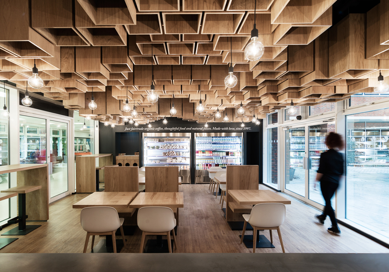 The Atkinson concept comes from the idea of creating an enveloping and warm space for Peabodys customers. Wood has been used on all surfaces; from  floor to furniture such as tables and counter.