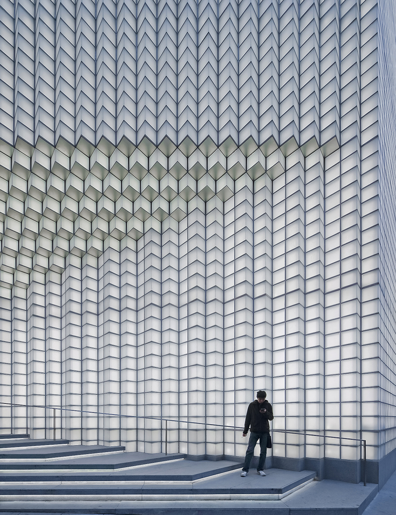 The usage of satin glass block and shot-blasted stainless steel is in great contrast to the chaotic city. During the day, it mutes the surroundings, while subtly reflecting the sunlight. In the evening, the view is icy and crisp, and the surface illuminates with embedded LED lights integrated into the joints of the masonry. The differing geometries and changing perspectives of the facade expresses the transformative nature of the city and the people of Shanghai.