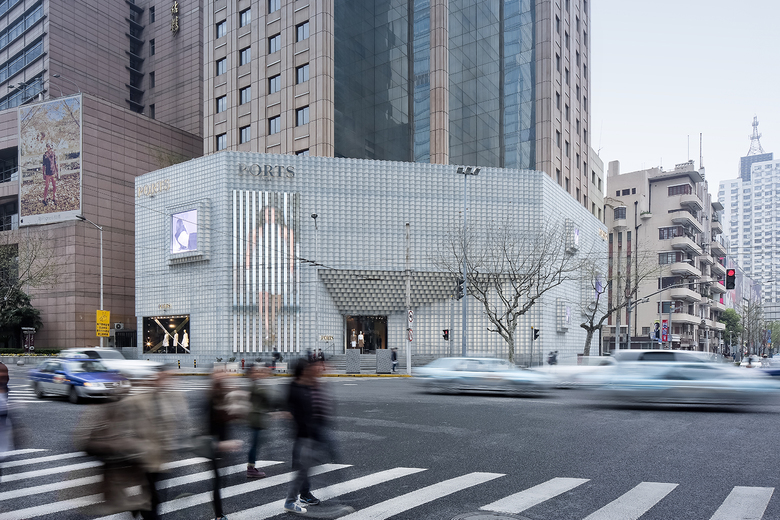 Located at a major high-end commercial district at the intersection of Changde Road and Nanjing West Road in Shanghai, a new façade is created for the fashion house Ports 1961's flagship store.