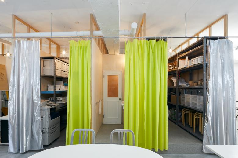 Facing the ENGAWA space, wooden sliding doors were installed as the main entrance to the office. It is composed of three sliding frame doors with corrugated polycarbonate sheets and a large sliding flush door with a galvanized steel sheet. The main activity of our office is architectural design work, but various activities are also usual such as meetings with visitors, internal study sessions, and sometimes public event inviting many people. In order to support such diverse and free use, the fixtures and curtains are designed to allow the modal change of space. If you fully open the sliding doors with polycarbonate sheet, Tori DOMA will be connected to the wide road via ENGAWA, and if the large sliding door is opened, the meeting space will be connected to the city. By designing the variation of multiple connections between interior / exterior spaces or between rooms, we believe it may have become a workspace with the atmosphere of open to diverse possibilities.